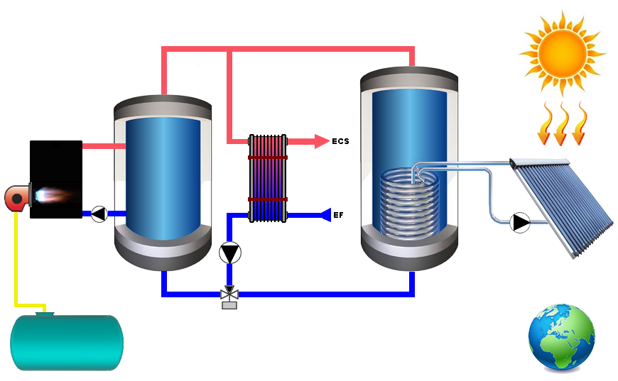 En hiver, la production solaire devient très faible, la régulation va chercher l'énergie du coté du ballon de stockage d'appoint, maintenu en température grâce à une chaudière à énergie stock (fuel ou gaz).